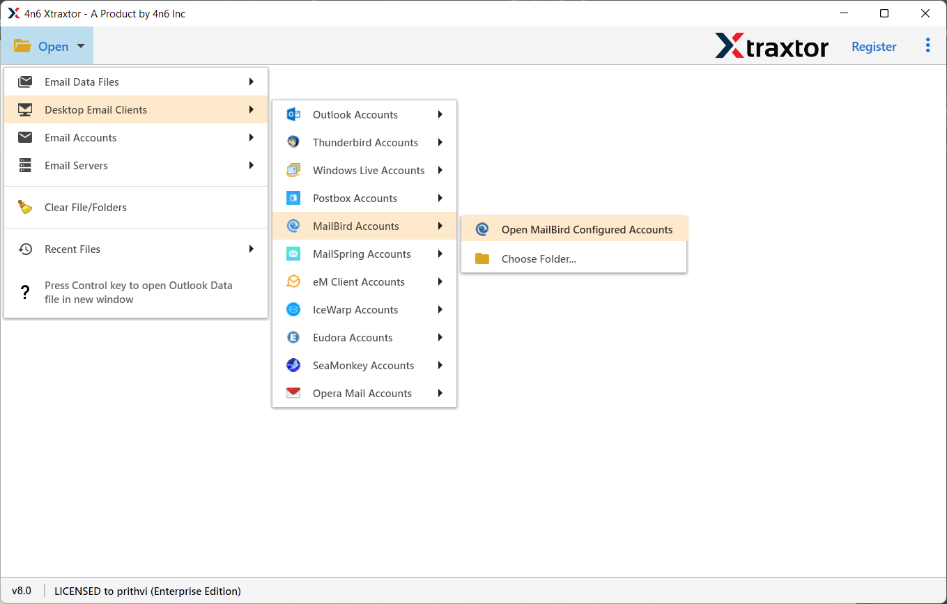 Step 2. Click on Open >> Desktop Email Clients >> Mailbird Accounts.